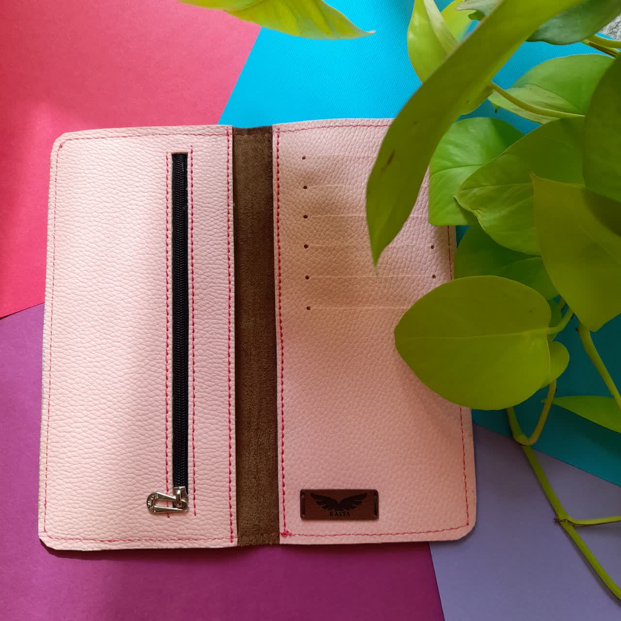 کیف پول چرمی کتابی تک رنگ صورتی روشن