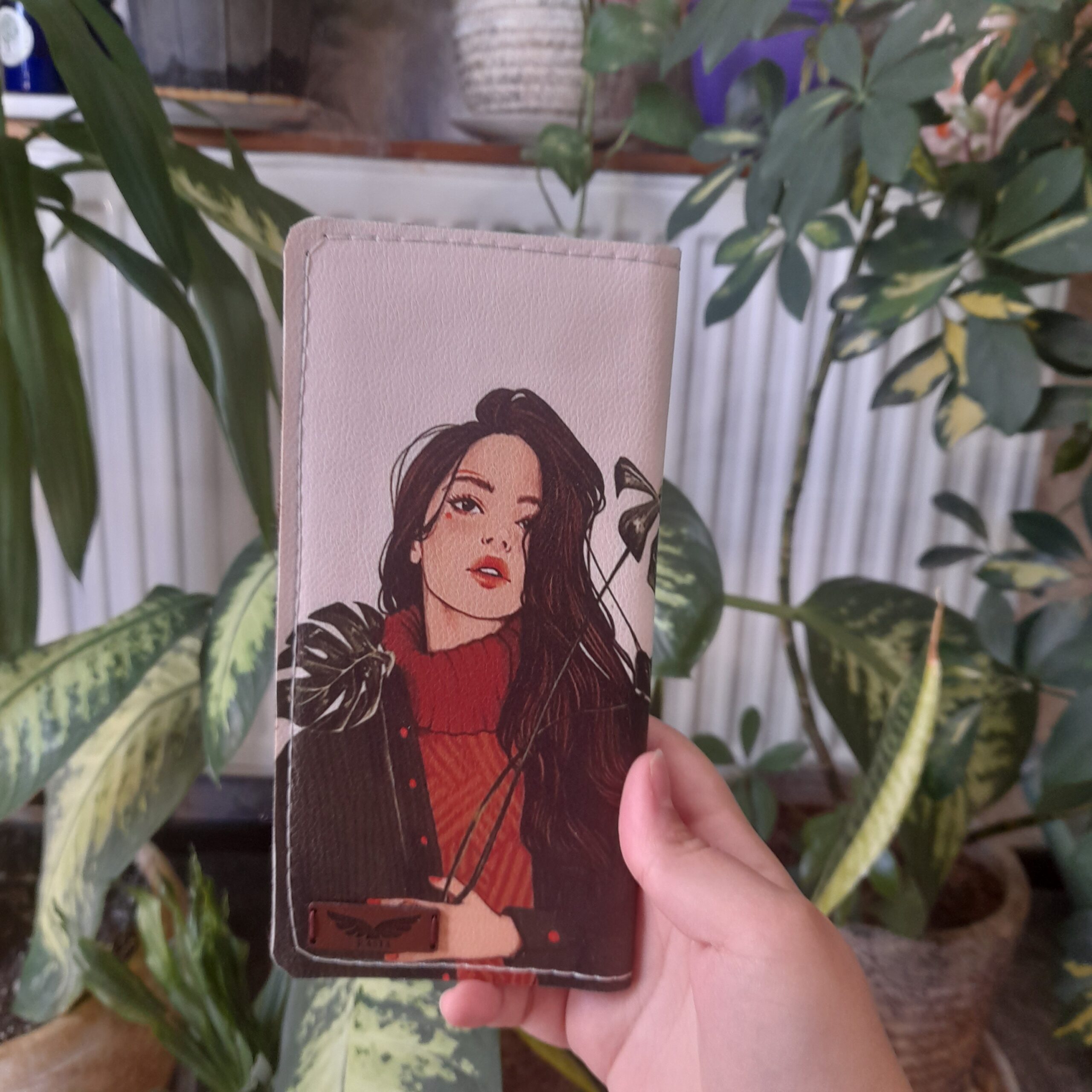 کیف پول چرمی کتابی پنلی طرح دختر برگ انجیری