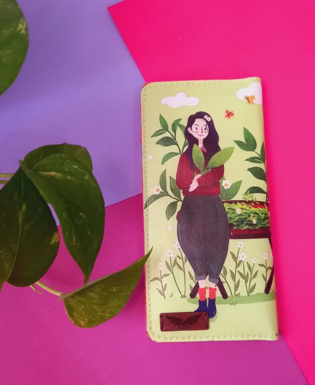 کیف پول چرمی کتابی طرح دختر برگ انجیری