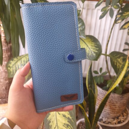 کیف پول چرمی کتابی تک رنگ آبی آسمانی